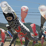 4月はじめから5月はじめまでの1ヶ月間、仁保川上空を多くのこいのぼりが泳ぎます。毎年増えているこいのぼりは、100匹を越えました。